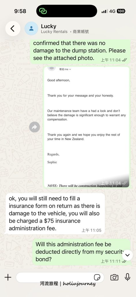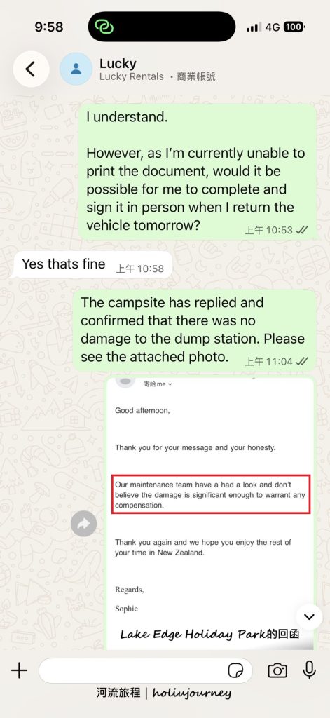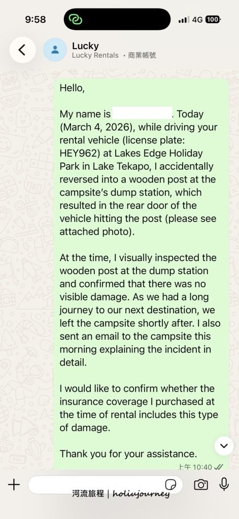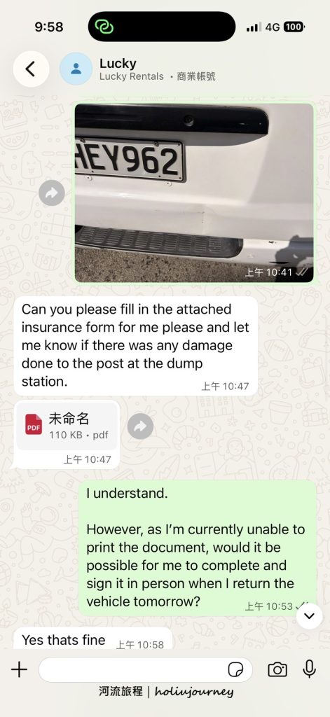 工作效率:衡量一家租車公司的服務效率,最明顯的例子莫過於他們的即時通訊支援。在這次紐西蘭南島的自駕行程中,河流旅程曾多次透過WhatsApp詢問車輛操作及車輛事故的相關問題,Lucky Rentals的工作人員均能以極高效率的速度給予回覆。