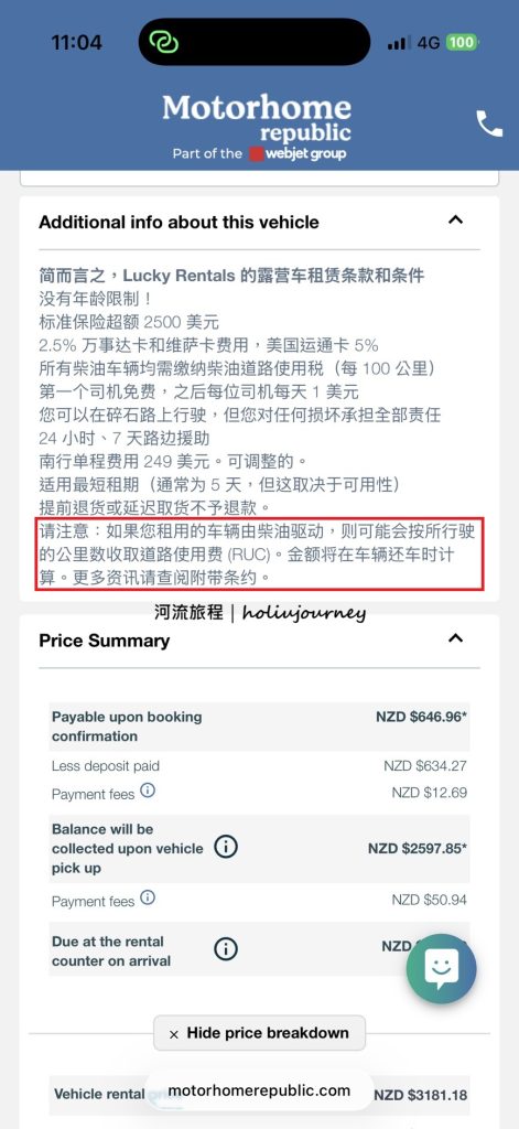 雖然河流旅程本次租賃之露營車並非柴油驅動,然Lucky Rentals之資訊仍明確告知RUC之計價方式。