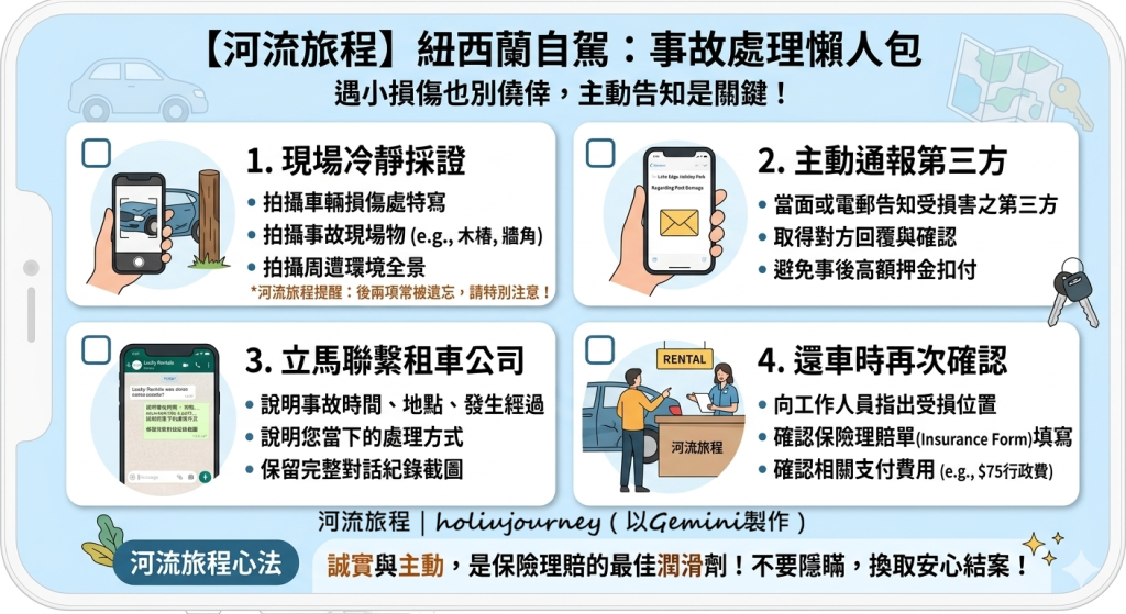 常有網路評論提到,如您已投保頂級全險,小小意外所造成的車體些微損傷,是無須特別告知租車公司,因為租車公司對於投保頂級全險的租客是不會做嚴格的檢查。這其實是非常錯誤且危險的觀念!事實上,若租車公司在後續清潔或檢查時發現損傷,不僅有權從押金中扣除維修費用,更可能因「隱瞞事故」判定您違反合約,導致保險失效。所以河流旅程強烈建議各位捧油,如真的不幸發生車輛的意外事故,應:
