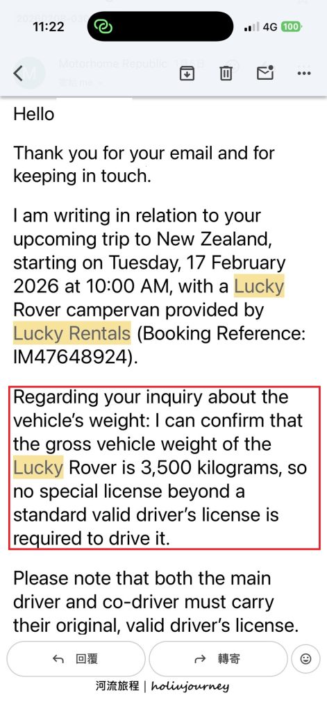 另外,或許有捧油會質疑透過Motorhome republic預訂露營車,取車前如有各式各樣問題想詢問租車公司,會不會有傳達錯誤或無疾而終的情況發生?河流旅程這次特別發揮了「實驗精神」,先後寄出了4封信件詢問細節。 我們發現Motorhome Republic並未敷衍了事,而是確實將問題轉達給Lucky Rentals,取得官方解答並整理後再回覆給我們。更重要的是-Motorhome Republic回覆效率極高,基本不會超過1個工作天