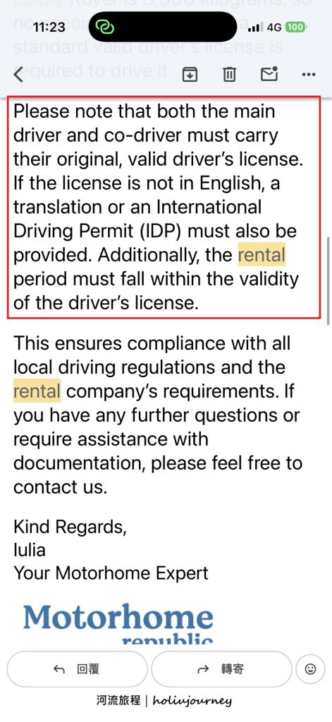 Motorhome republic明確於信件中提及「需攜帶有效的駕駛執照原件及國際駕照,且駕駛執照原件於租賃期間內是屬有效的」。