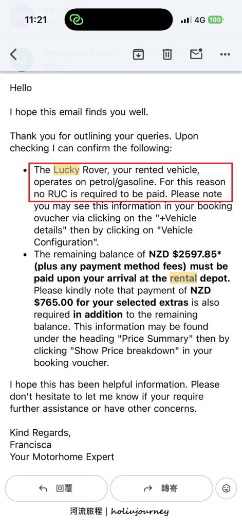 再次向Motorhome republic確認本次所租賃之露營車是否需支付RUC。