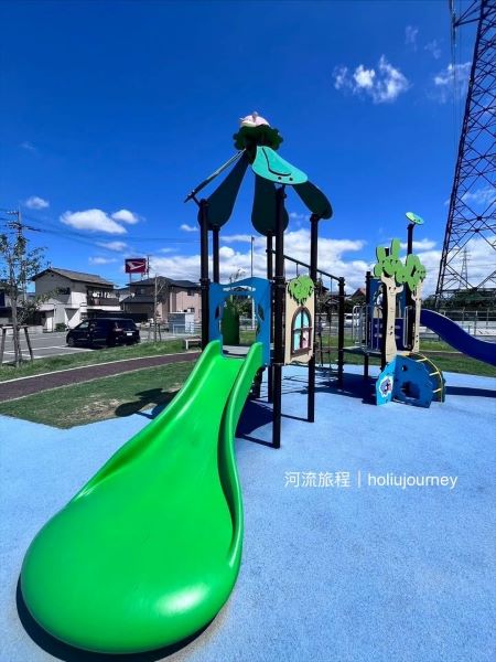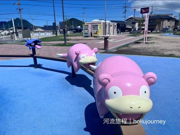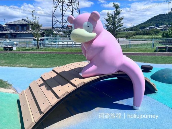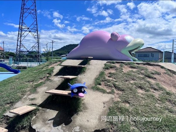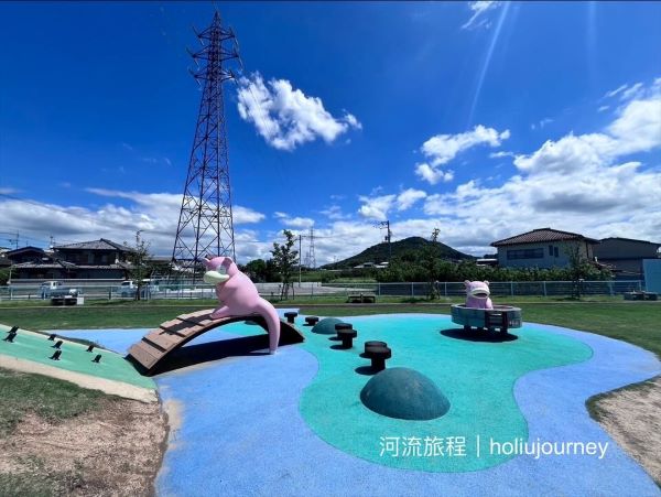 粉紅色的呆萌外表,在公園的溜滑梯、盪鞦韆擺放各種姿勢,不過公園並不大,一小圈就逛完了,旁邊有兩個涼亭、廁所可以稍作休息,公園旁有停車格,當日(2024年9月1日)中午左右抵達,非常顏色,人潮並不多。
